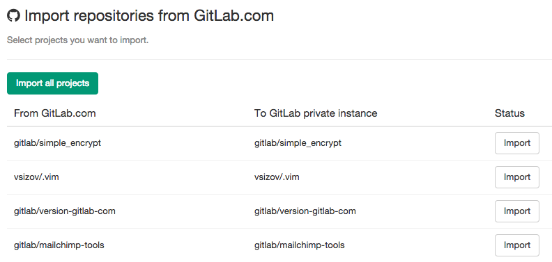 Click on the "Import projects from GitLab.com" link and you will be redirected to GitLab.com for permission to access your projects. After accepting, you'll be automatically redirected to the importer.